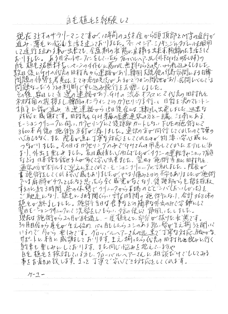 韓国についてはブログでも動画でもお伝えしましたが怖さとかは何もなくむしろ観光みたいに楽しめた。 3ヶ月目くらいからどんどん実感が出てきては太く濃く育ってくるのを楽しみに待っている状態だった。 ボリュームがでてよく生え揃っています。またどこまで植えた髪なのか境目かわからないほど髪が生え揃っています。韓国自毛植毛はまさにバンジージャンプのようでした。 飛ぶ前は怖いけど飛んでしまうとなんてことない。そして後は大きな見返りがありました。