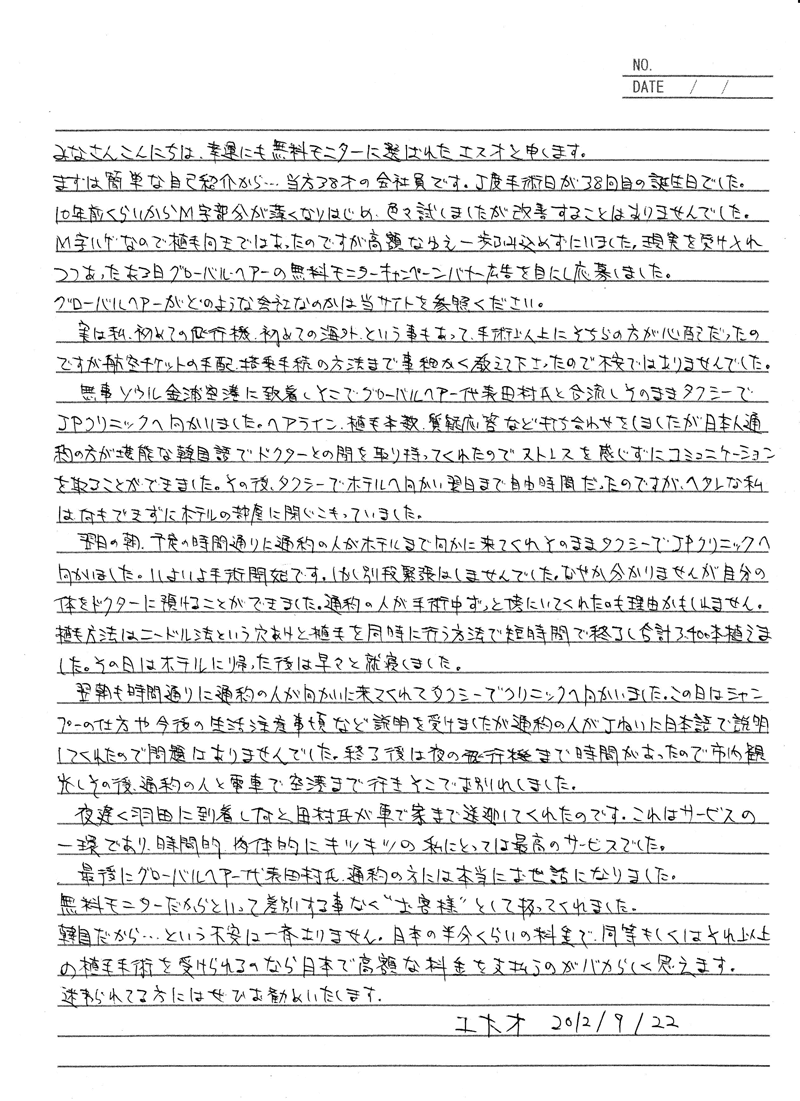 前髪を垂らしていた若い頃の髪型に完全に戻りました。 M字のせいでキマらなかった髪型が今では簡単にセットできます。 施術直後はやはり結果が気になってよく鏡を見ていましたが今は鏡を見なくなりました。 悪い意味ではなく自毛移植をしたことを忘れました!(笑) はっきりいってすごく満足しています。 滞在中はアテンダントが全部通訳してくれました。